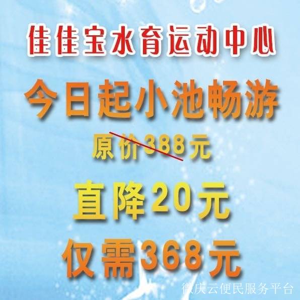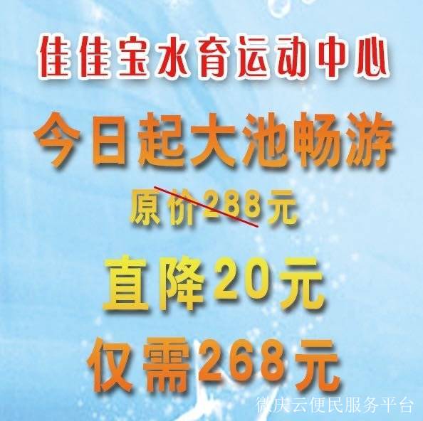 佳佳宝婴幼儿水育运动中心是一家集婴幼儿游泳、洗澡、抚触、被动操等多种项目于一体的专业婴幼儿服务机构。馆内设施先进,配有亚克力大型高级游泳池1个,小型泳池6个。同时特有冲浪,泡泡浴泳池及配套水过滤、消毒系统,保障宝宝畅游的安全和健康! 佳佳宝婴幼儿水育运动中心是庆云县唯一一家入选鲁北孕婴协会的会员店,现有高级育婴师1名,游泳早教师6名。开业前期,工作人员专门赴上海接受国内知名早教专家金国壮教授培训,保证每个宝宝能够得到最有效、最专业的水育服务。